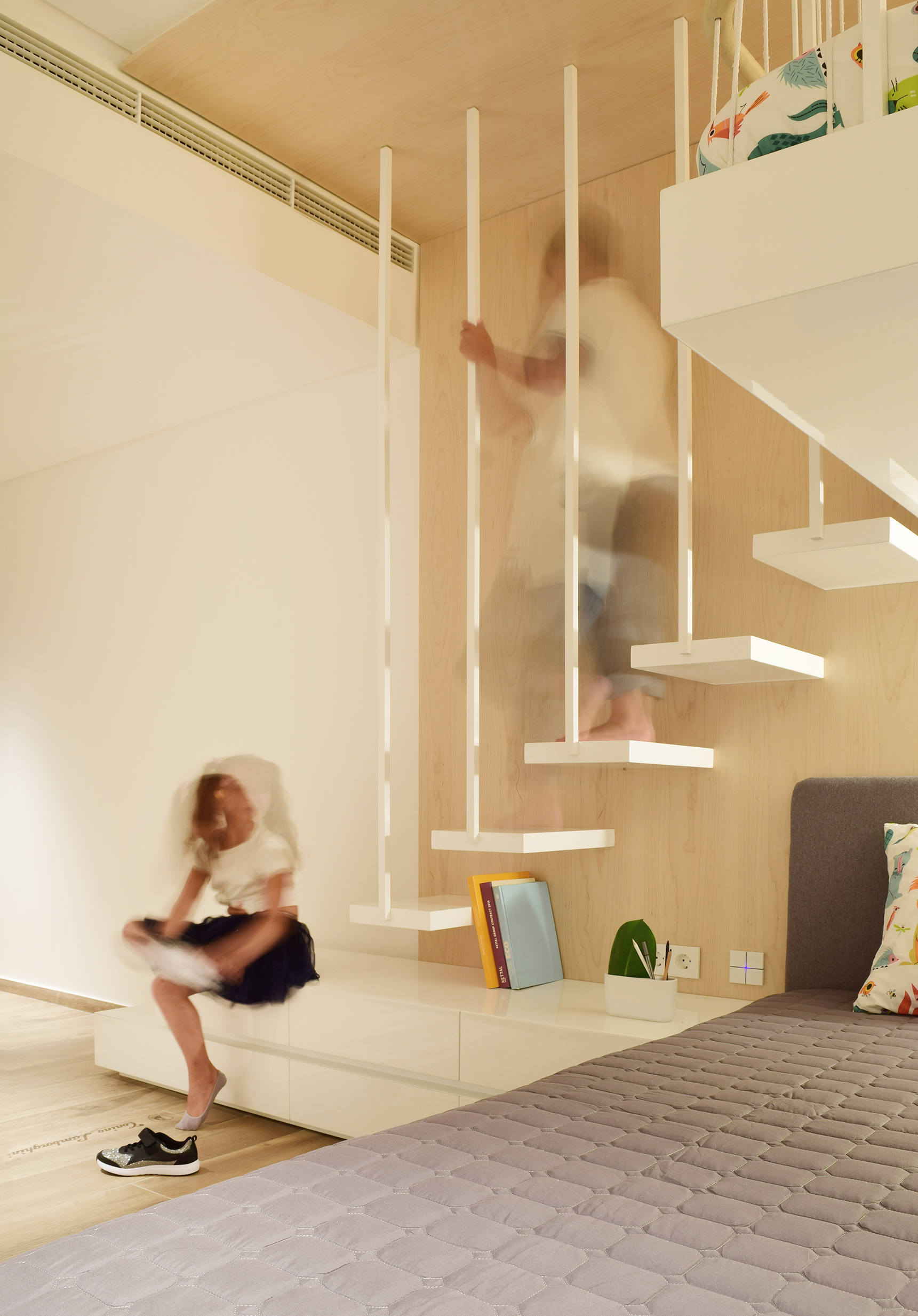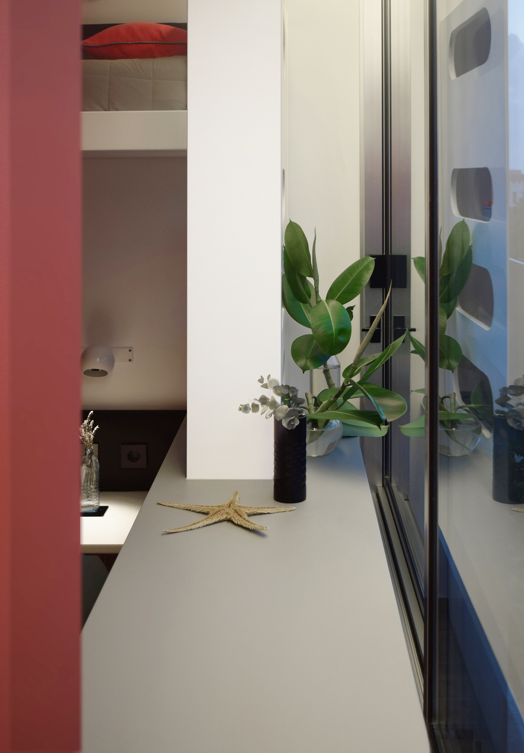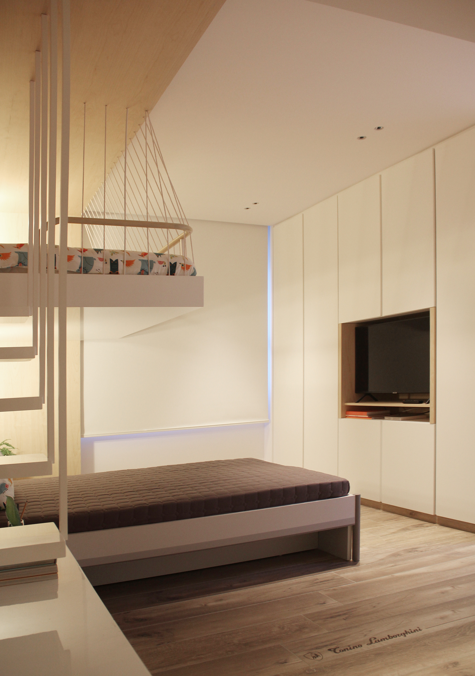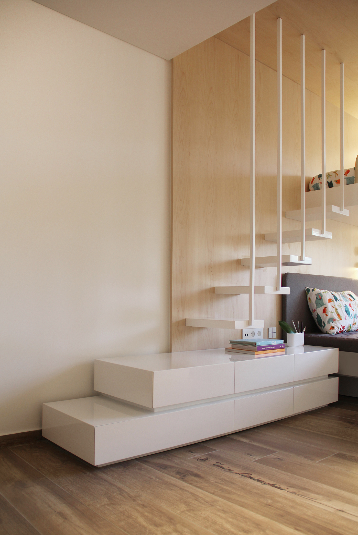 The Penthouse is urban but nevertheless cozy, warm but open to the surroundings. It is flooded with light, but also filled with shadows, with modern engineering and using natural materials. These were the first clear concepts agreed with the owners for their future apartment. Materials are light, contrasted with colorful and vibrant furniture. The volumes consisted of light wood veneer, shiny white wood with the repetitive geometric volumes.