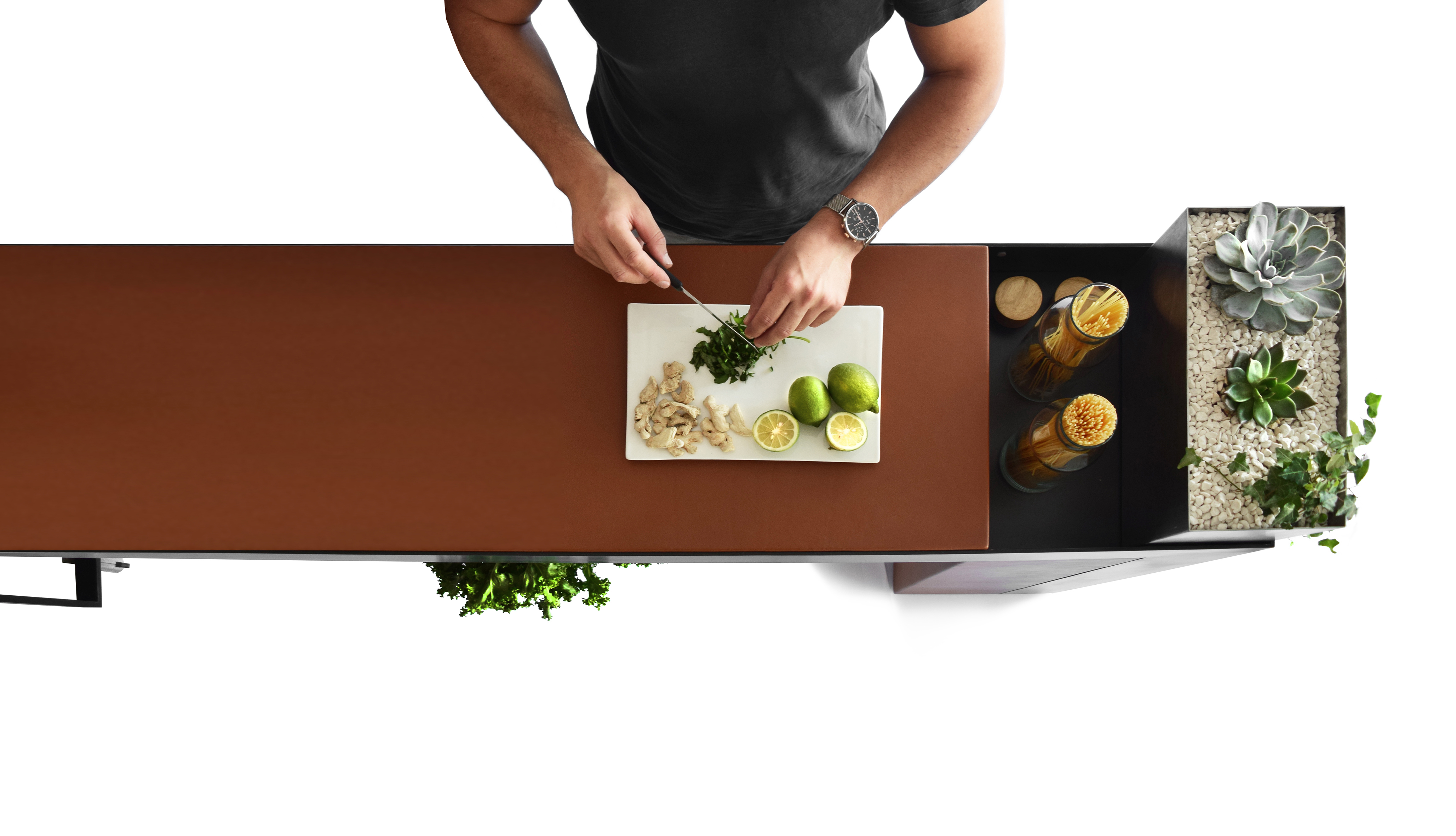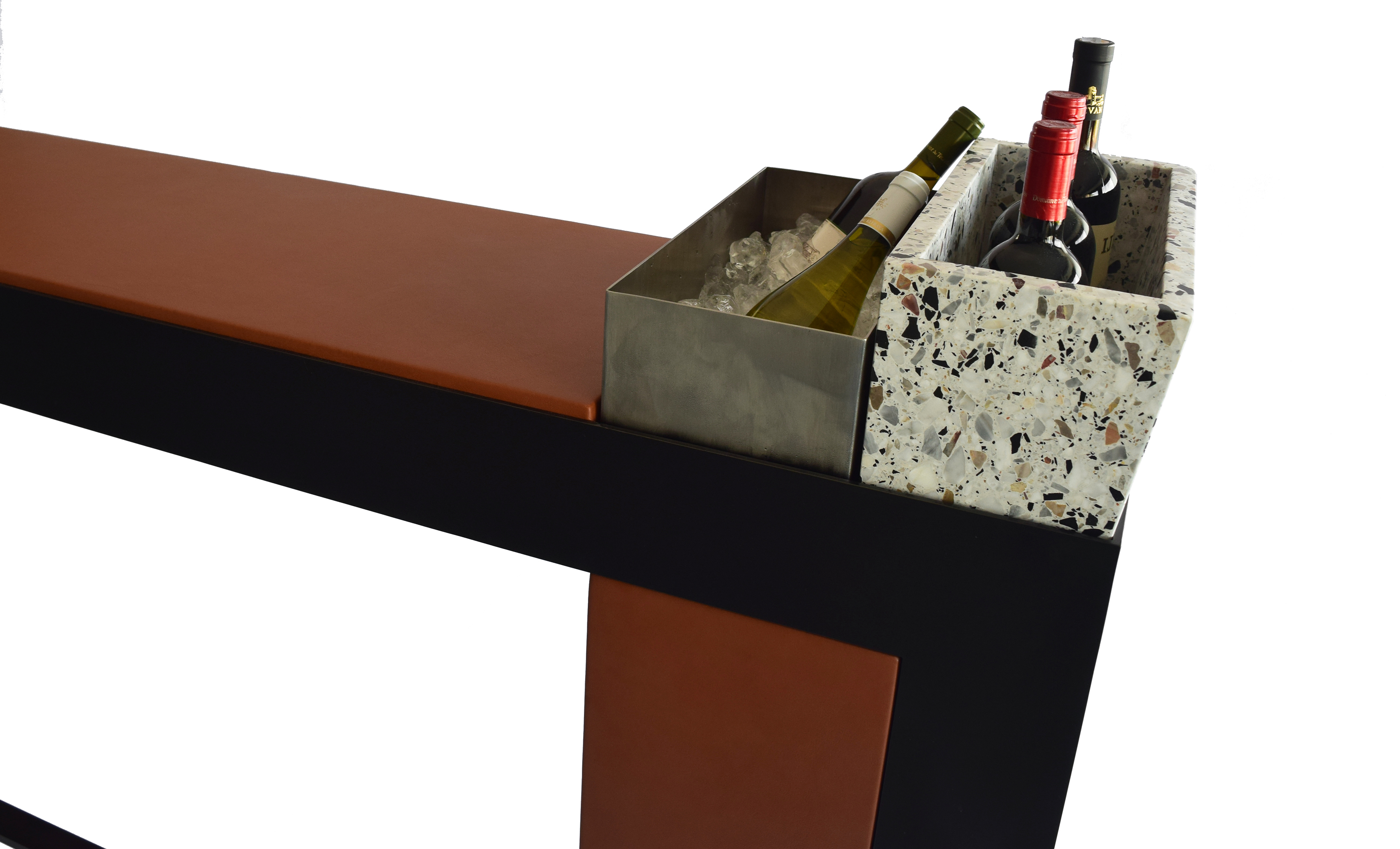 The tensile strength of gunmetal steel, the energy of genuine leather, and the authenticity of terrazzo, meet the purity of stainless steel. This bespoke bar incorporate a smart storage space, a battery powered electrical socket and a dimmable decorative LED lighting at the low bottles display area, that can be recharged by plugging it in any power outlet nearby. Multiple accessories are equipped with ON that serve different functions like the multi-purpose terrazzo and stainless steel boxes, in addition to the stainless steel greenery pot and ice bucket.