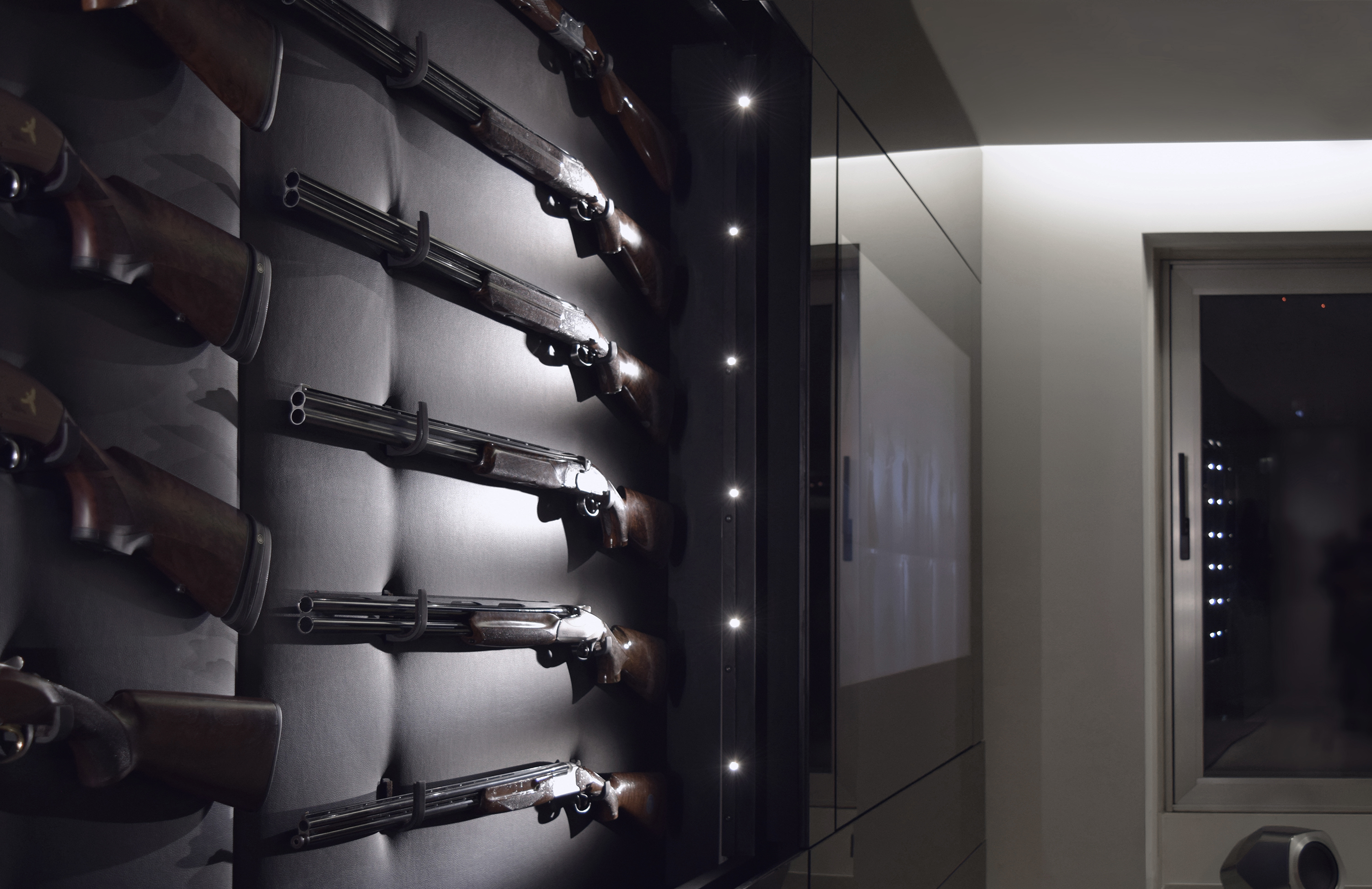 A 12 rifle display, a 75" television, a wine cabinet with a cooler,